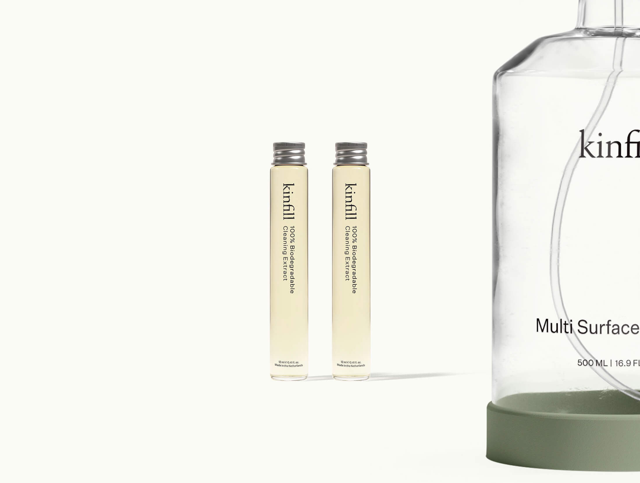 - Two glass refill vials for multiple surfaces. Developed to be fully and easily recyclable.